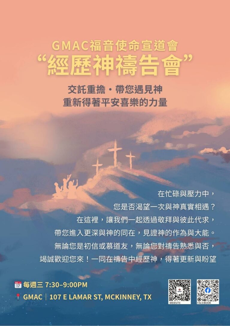 我們誠摯邀請你參加每週三晚上的**「經歷神禱告會」**,在神的同在中得著安慰與力量,學習安靜、交託,將一切重擔放在主的腳前。