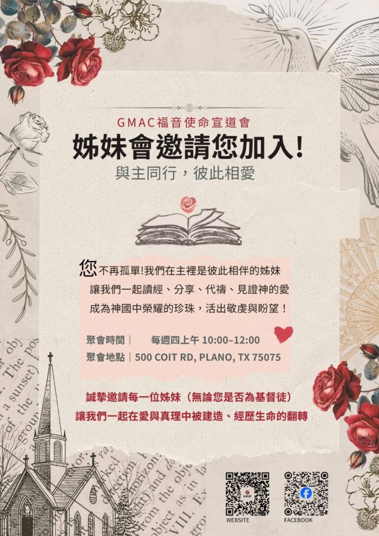 姊妹會是一個屬靈的家,我們每週相聚,不只是讀神的話語,更在彼此的分享中被鼓勵,在代禱中得著力量。這裡是一個讓人安心敞開的地方,妳可以帶著歡笑,也可以帶著眼淚,因為我們願意傾聽、同行、代求。